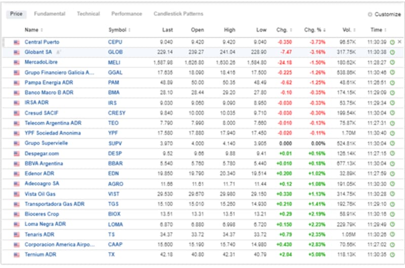Del lado bajista, Centra Puerto, Globant, Mercado Libre y Grupo Financiero Galicia son las que lideran las debilidades, con caídas de entre 1,5% y 3,7%.