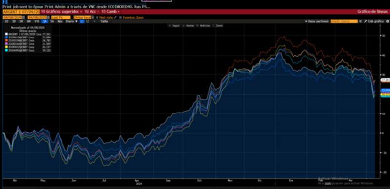 En lo que va del mes, la renta fija argentina muestra pérdidas de entre 4,6% y 9%, siendo los bonos más largos los más afectados. Tras el ajuste actual, la curva de bonos soberanos se desplazó al alza, con rendimientos de 15% en el tramo corto y de 13% en el tramo medio y largo.