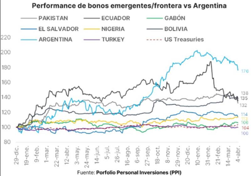 Al comparar la dinámica de los bonos argentinos versus otros créditos, también se ve una fuerte merma en términos comparativos.