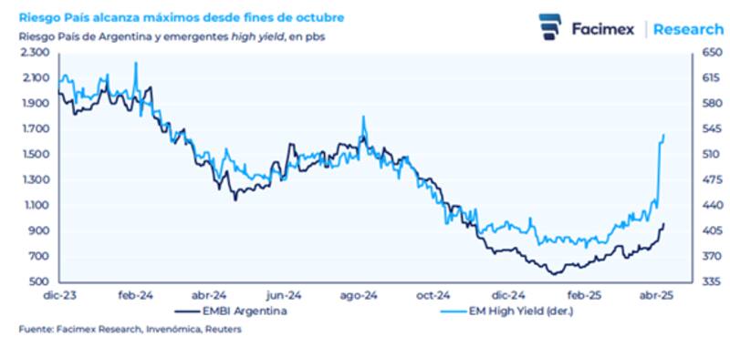 "Ayer los spreads de EMHY cerraron en 538pbs y el Riesgo País de Argentina en 960pbs; cuando en agosto del año pasado los spreads de EMHY estaban en niveles similares a los actuales y el Riesgo País de Argentina era superior a los 1.500pbs. Esto refleja que, solo por el escenario global, el deterioro de Argentina podría profundizarse. Tampoco hay que perder de vista que los spreads de EMHY están lejos de los niveles de crisis, es decir, 1193pbs en marzo de 2020", dijo.
