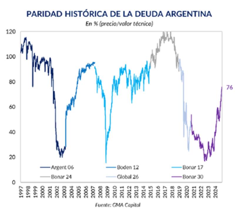 La paridad de los bonos argentinos se ha recuperado desde valores de profundo estrés financiero.