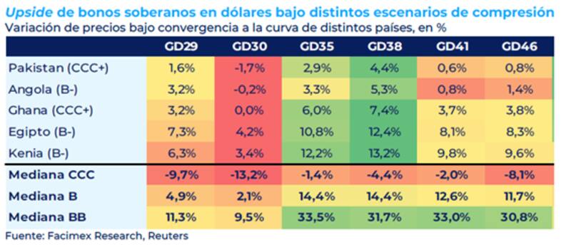 Según sus cálculos, el potencial alcista en el GD35 y GD41 es del 13% y 14% respectivamente si Argentina converge a la mediana de los créditos "B" y 33% si converge a la mediana de los créditos "BB".