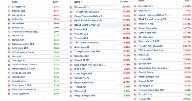 Por último, en el acumulado del año, acciones de MercadoLibre, Globant, Grupo Financiero Galicia, BBVA Argentina, Bioceres, Grupo Supervielle, Loma Negra, Despegar, Banco Macro, Telecom, YPF, IRSA y Ternium caen mas del 20%.