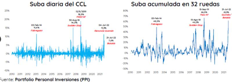 Según datos de Portfolio Personal Inversiones, la suba acumulada del dólar contado con liquidación en las últimas 32 ruedas, de 61,3%, sólo es superada por 66,5% tras el triunfo de Alberto Fernández en las PASO 2019. Así, está a un paso de convertirse en la mayor turbulencia desde la salida de la convertibilidad.
