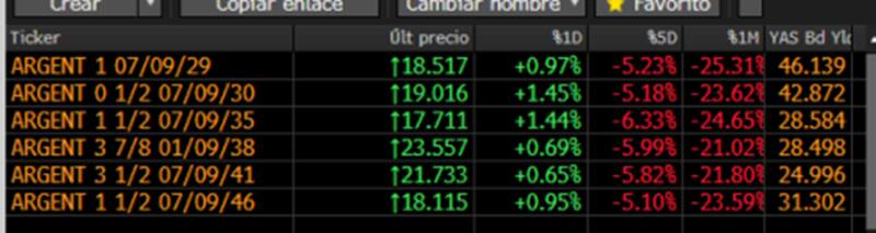 La parte más corta de la curva recupera 0,97% en el Global 2029 y 1,45% en el Global 2030. Por su parte, el tramo medio también sube 1,4% en el Global 2035 y 0,7% en el Global 2038. Finalmente, los bonos más largos avanzan entre 0,65% y 0,95%.