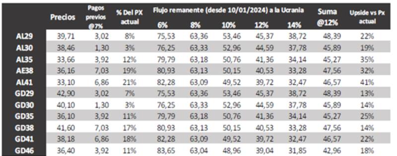 Los analistas de Delphos Investment realizaron análisis similares y en el que concluyeron que, descontando los pagos hasta enero de 2024 inclusive a una tasa similar a los rendimientos de países CCC y sumado al escenario de reestructuración Ucrania descontado al 12%, el potencial upside de los bonos locales es de entre 13% y 41% en promedio.
