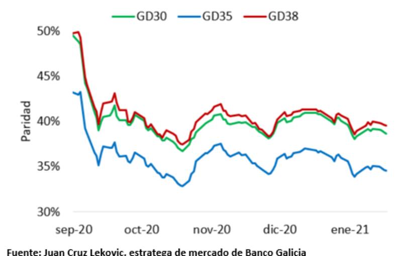 En línea con el deterioro que han sufrido los bonos argentinos puede verse que las paridades de los mismos se encuentran en mínimos desde la reestructuración de la deuda. Toda la curva de bonos argentinos en dólares operan con paridades debajo del 40%, luego de haber debutado tras la reestructuración con paridades en torno al 50% y 45%.
