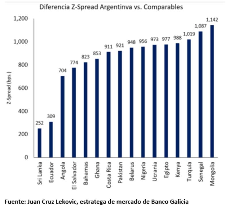 La deuda de Argentina rinde 252 puntos básicos más que los bonos de Sri Lanka y 309 puntos básicos mas que los bonos de Ecuador, país que recién reestructuró su deuda, similar a la Argentina. Otras comparaciones exhiben que la Argentina rinde entre 700 y 900 puntos básicos mas respecto de lo que rinden los bonos de Angola, El Salvador, Bahamas o Ghana.
