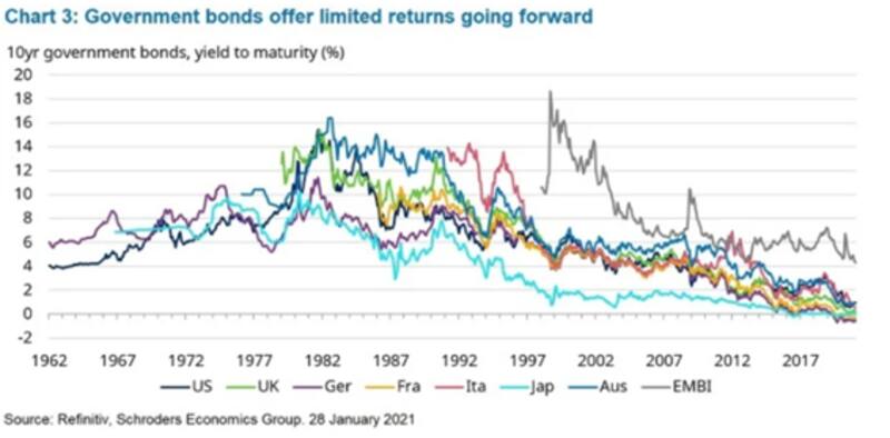 Sobre este punto, los analistas de Schroders afirmaron: "Los rendimientos de la deuda pública de referencia a 10 años están en mínimos históricos o cerca de ellos. A medida que los precios de los bonos suben, bajan los rendimientos y los actuales niveles significan que será difícil lograr mayores ganancias significativas en los precios. Nuestro pronóstico es que tendremos tasas de interés de los principales bancos centrales del mundo sin cambios en 2021 y también para 2022".