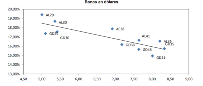 Los bonos argentinos siguen fuera del radar y se encuentran entre los instrumentos de renta fija más riesgosos del planeta. Para ver dónde están parados los bonos argentinos solo resta mirar el nivel y la pendiente de la curva de deuda soberana. La deuda ley local rinde 19,4% en el tramo corto y 16,5% en el tramo largo. Por su parte, la deuda de ley Nueva York rinde 17,5% en el tramo más corto y 15% en el más largo.