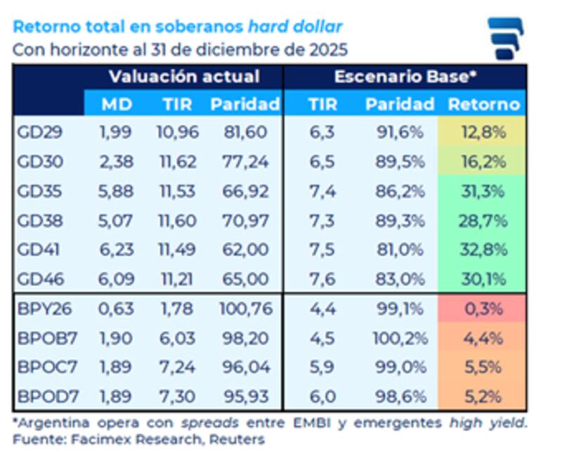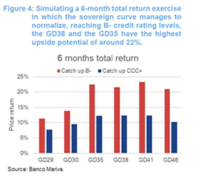 Según sus cálculos, simulando un ejercicio de retorno total de 6 meses en el que la curva soberana logra normalizarse, alcanzando niveles de calificación crediticia B-, el GD38 y el GD35 tienen el mayor potencial de alza, en torno al 22%.