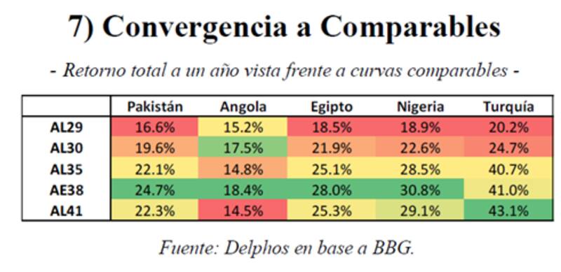 Finalmente, y mirando hacia adelante, para Delphos, el potencial alcista de los bonos de ley local, el AE38 es el de mayor potencial alcista.