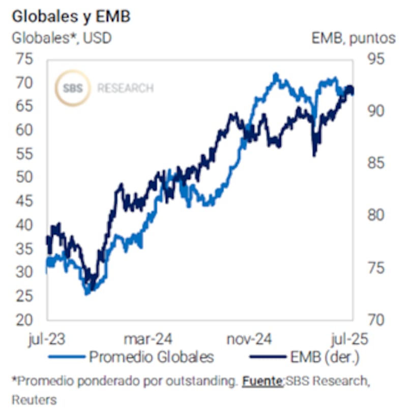 "A pesar de un mayor objetivo fiscal, una desinflación exitosa, una reactivación de la actividad más veloz de lo esperado y un programa con el FMI mejor de lo previsto, la curva soberana argentina no logró subirse a la ola de apetito por emergentes y se mantiene en torno a los 700 pb de riesgo país, mientras que la región y otras curvas comparables han tenido un muy buen bimestre", advierten