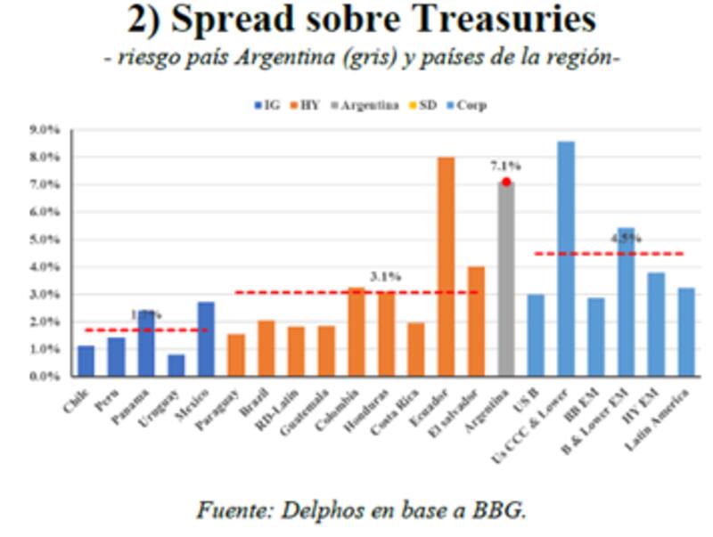 El riesgo país ronda los 710 puntos básicos, frente a un promedio de 170 para los emisores investment grade de la región y de 310 para los high yield.