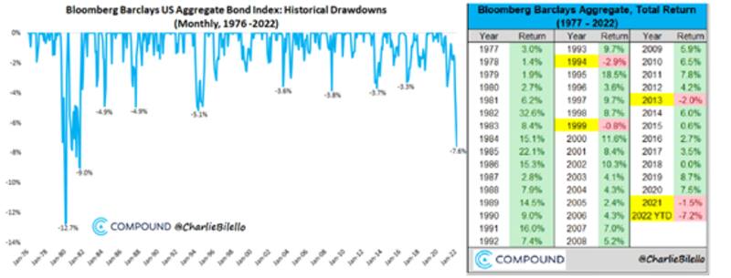 De esta manera, la actual la caída es la más significativa del mercado de bonos de EE.UU. en la historia ya que acumula 20 meses y consecutivos y es la de mayor magnitud (-7.6%) desde 1981.