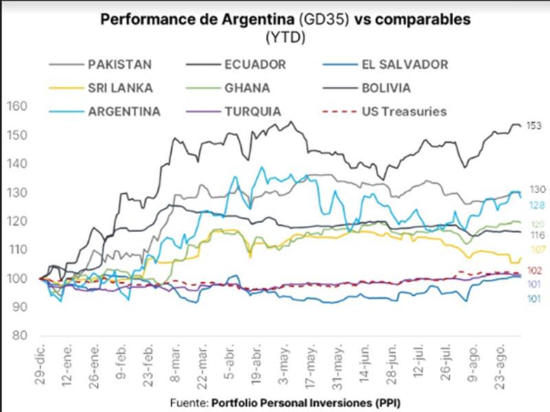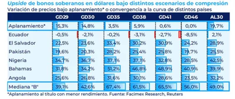 En ese sentido, y pensando en un contexto de normalización de la curva soberana, la cual podría converger hacia rendimientos de créditos similares a los de la Argentina, el título que más podría subir en ese trayecto es el GD35, con una ganancia de 67%, seguido por el GD41, con un potencial upside de 65%.