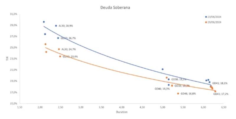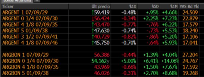 "Los bonos GD41 y AE38 dado las bajas paridades resultan defensivos ante un escenario adverso y dada la convexidad dependiendo de cuanto comprima la curva podrían brindar un mayor upside que los cortos. A pesar de esto los bonos cortos podrían comprimir más rápido dado que son los que permiten recuperar el capital de manera más acelerada", explicaron desde Grupo IEB.