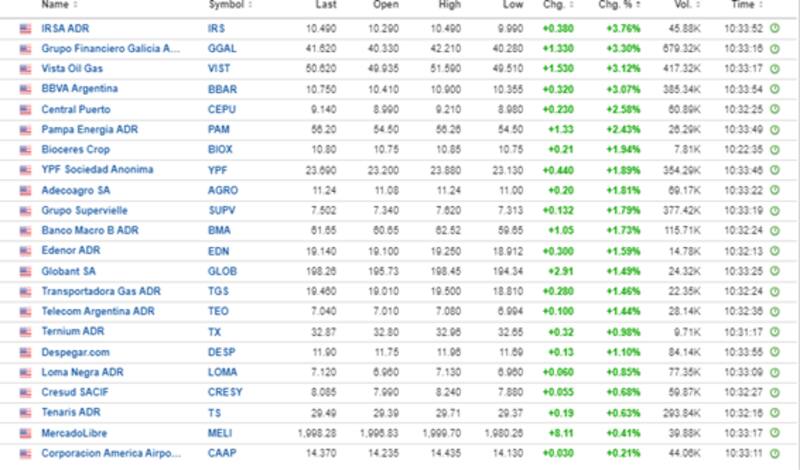 Las mayores subas se registran en IRSA, que gana 3,7%, seguida por Grupo Financiero Galicia, Vista, BBVA Argentina y Central Puerto, con avances de entre 2,6% y 3,3%.