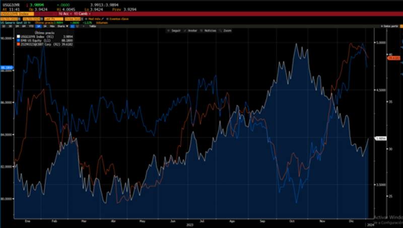 "Vemos una buena perspectiva para los bonos. En la última reunión, la Fed mantuvo el rango de tasas en el corredor de 5,25% - 5,5% y la máxima autoridad de la entidad señaló que es probable que el ciclo de política monetaria contractiva haya concluido. En cuanto a esto, la Fed proyecta tres bajas de tasas para fines de 2024 siendo una dinámica que favorecería notablemente al segmento de bonos emergentes y distressed", comentaron desde PPI.