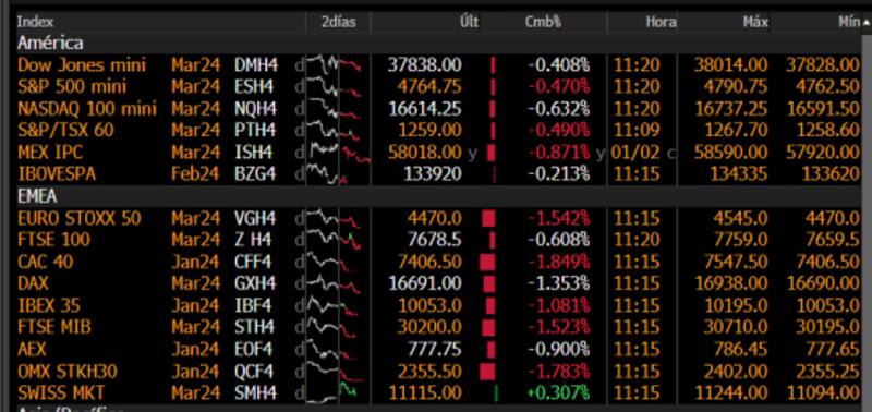 El Global 2029 baja 1%, mientras que el Global 2030 retrocede 0,61%. En el tramo medio, los Globales a 2035 y 2038 caen 0,95% y 0,91% respectivamente.