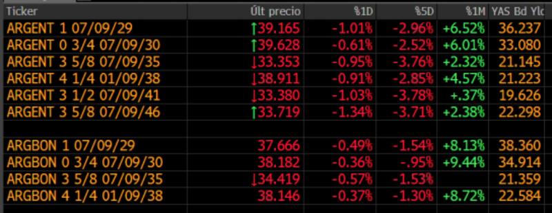 Finalmente, la deuda más larga también muestra una apertura en rojo, con una merma de 1,03% y 1,35% en el Global 2041 y Global 2046 respectivamente.