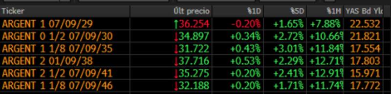 Yendo a los papeles en concreto, el Global 2030 (GD30) ganó un 0,34% y el GD38 trepó un 0,53 por ciento.