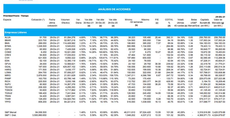 El S&P Merval finalizó la anteúltima rueda del año con un alza de 1,48%, que situó su valor en 84.006,50 puntos. En sintonía con esta mejora, la mayoría de los papeles del panel principal cerraron positivos.