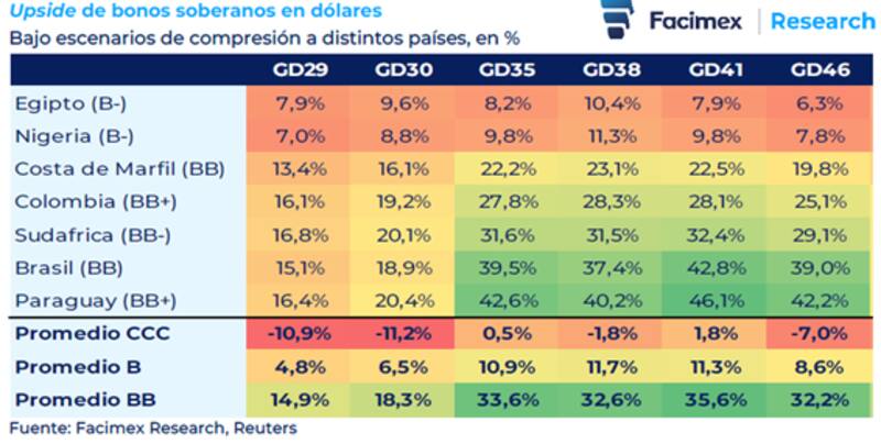 En el tramo medio y largo de la curva se pueden evidenciar ganancias entre 8,5% y 12% para operar como bonos "B" y subas de entre 32% y 33% para la convergencia a créditos "BB", según Facimex Valores.