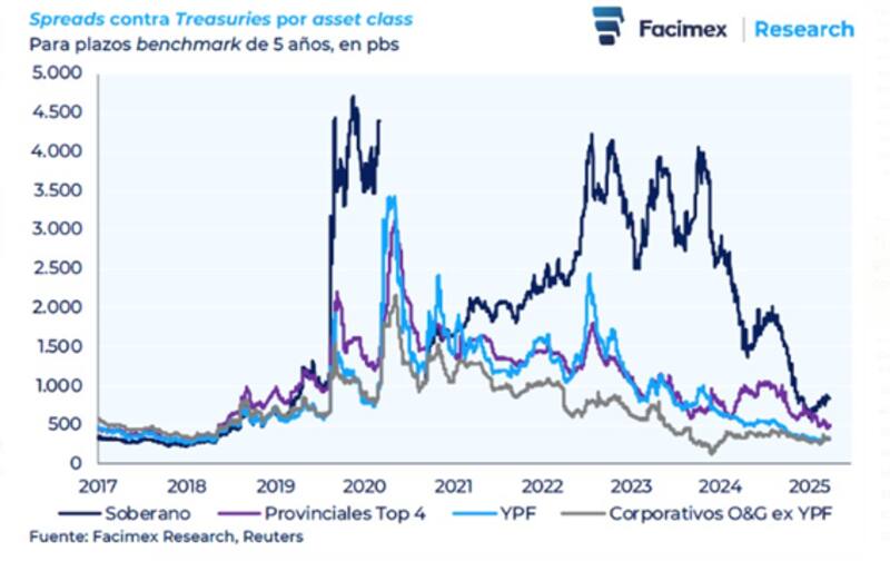 "El potencial sigue estando en soberanos. Creemos que el nuevo programa con el FMI dará un nuevo impulso a la compresión de spreads permitiendo que Argentina pueda volver al mercado para refinanciar los vencimientos de capital de julio. Luego de ello, esperamos una profundización su compresión hasta ubicarse hacia fin de año entre los emergentes high yield y el EMBI (entre 304-430pbs)", indicaron desde Facimex Valores.