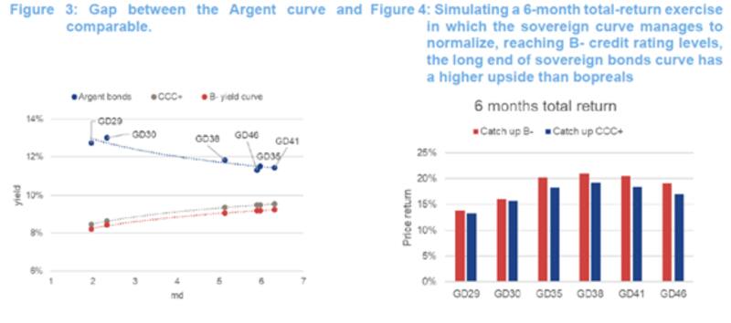 Según sus estimaciones, simulando un ejercicio de retorno total de 6 meses en el que la curva soberana logra normalizarse, alcanzando niveles de calificación crediticia B-, desde Research Mariva indicaron que el extremo largo de la curva de bonos soberanos tiene un mayor potencial alcista que los bonos de corto plazo, con un aumento potencial por encima del 20%.