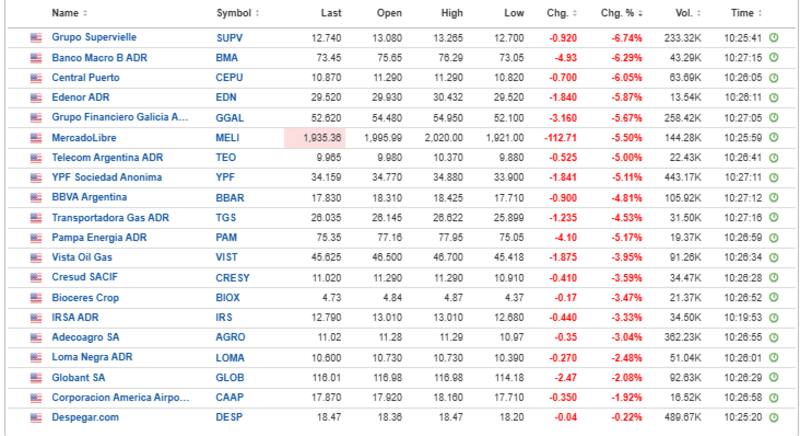 Otros paplees como Grupo Financiero Galicia, Mercado Libre, Telecom, YPF, u BBVa Argentina también caen entre 4% y 5%.
