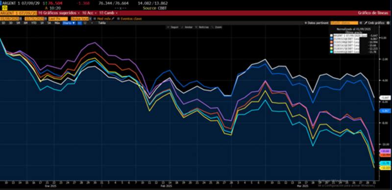Así, desde los máximos históricos alcanzados este año, los bonos locales muestran pérdidas de entre 5% y 6% en el tramo corto y con mermas de entre 10% y 12% en los títulos de mayor plazo.
