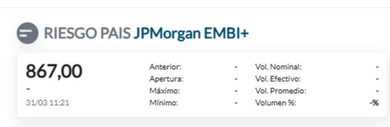 Con la baja de los bonos, el riesgo país se disparó a su mayor valor desde noviembre del año pasado, tocando los 867 puntos.