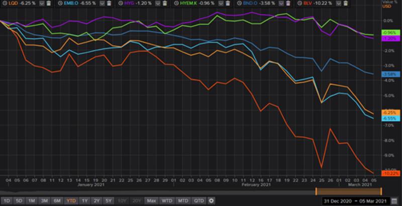 Los bonos con vencimientos más largos registran caídas del 10% mientras que los bonos de grado de inversión y de mercados emergentes pierden más del 6% en lo que va del 2021. El índice de bonos global pierde 3,6% y los bonos de grado especulativo, como los bonos de alto rendimiento y de alto rendimiento de emergentes, pierden solamente 1,2% y 0,96% este año. Es decir, que mientras la tasa sube, los bonos tienden a sufrir.