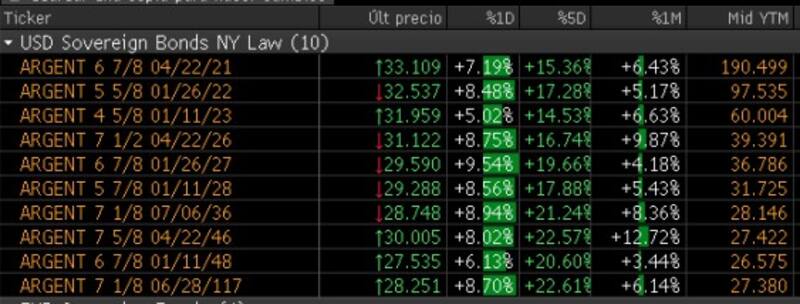 Los bonos argentinos en Wall Streetarrancaron la semana en verde, con la mirada puesta en la negociación de la bonos. El viernes venció el plazo para aceptación de la propuesta de reestructuración de deuda de Martín Guzmán y desde el Gobierno afirmaron que siguen trabajando en llegar a un acuerdo, por lo que se estira el plazo para el 22 de mayo. En esa fecha vence la posibilidad de que el Gobierno acredite los cupones de intereses de bonos Globales que vencían el 22 de abril pasado y para el cual el país tiene 30 días para efectivizar el pago. Debe resolver el tema de la deuda o pagar dicho cupón de intereses para así evitar el default .