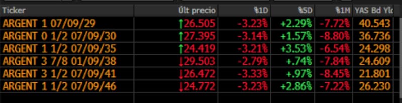 En el tramo medio, los Globales a 2035 y 2038 operan con pérdidas de 3,2% y 3,8%, mientras que, en el extremo más largo, la deuda pierde 3,3% en el Global 2041 y 3,23 por ciento en el Global 2046.