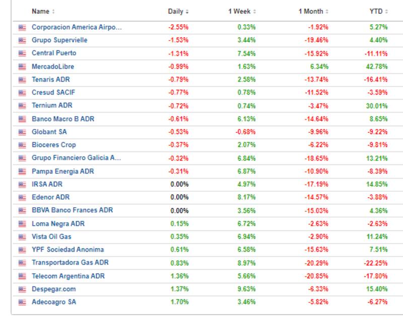 Las acciones argentinas en Wall Street operan mixtas. Por el lado bajista, Corporación América, Grupo Supervielle, Central Puerto y Mercado Libre lideran las bajas, cayendo entre 0,8% y 2,55%.