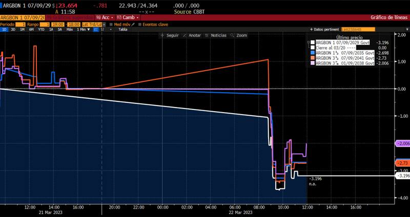 El Bonar 2029 (AL29) y Bonar 2030 (AL30) retroceden 3,69% y 3,73% respectivamente. Por su parte, los bonos a 2035 y 2038 de legislación local muestran pérdidas de 3,3% y 3,1% respectivamente.