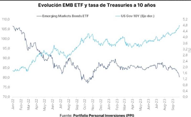 Los analistas de Portfolio Personal Inversiones (PPI), también remarcan que la suba de tasas complica a los bonos de emergentes, incluidos los locales.