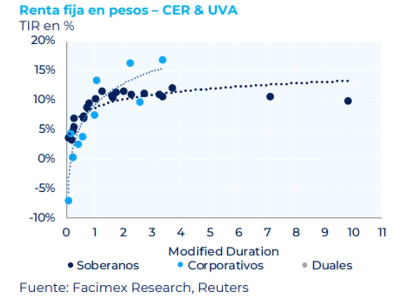"Los activos CER lucen como un posicionamiento recomendado de mediano y largo plazo, que incluso si vuelve a los valores anteriores puede dar algo de premio de corto. La curva CER sigue teniendo algo de volatilidad, pero como posicionamiento con un horizonte de inversión más largo, luce atractivo tanto para inversores que necesitan cubrirse de la inflación como para aquellos que buscan rendimientos reales positivos. Vemos valor tanto en el tramo corto como medio de la curva", señaló.