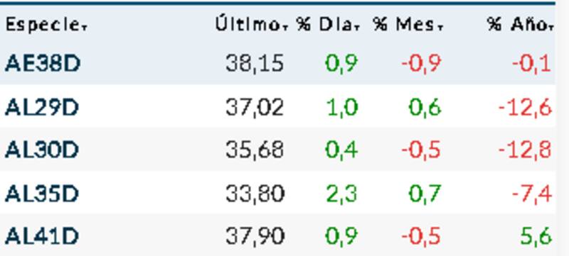 Entre los ley local, se destacó la suba del AL35D (2,3%), seguido por AL29D (1 por ciento).