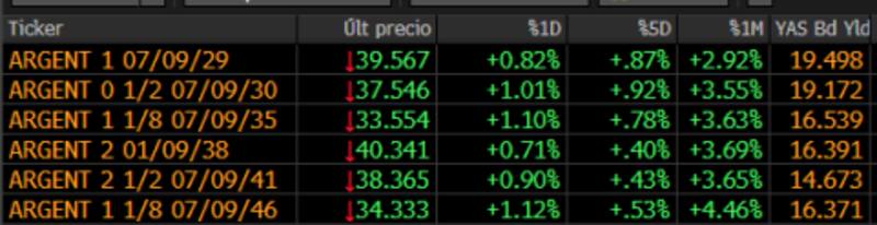 Entre los títulos emitidos bajo jurisdicción extranjera, el alza más importante la ostentó el GD46, que ganó 1,12%, seguido por el GD35 (1,1%) y el GD30 (1,01 por ciento).