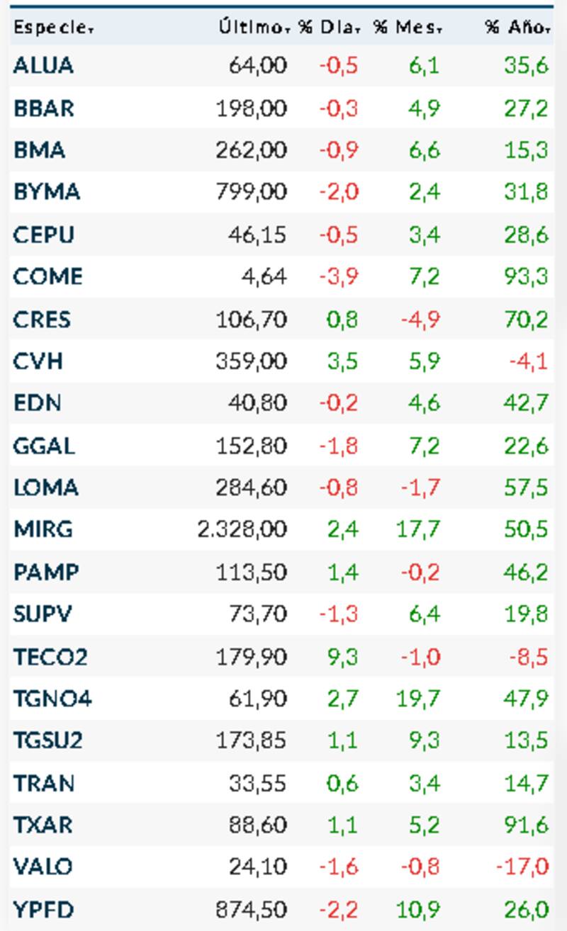 Entre las bajas, la más importante la registró Sociedad Comercial del Plata (-3,9%) seguida por YPF (-2,2%) y ByMA (-2 por ciento).
