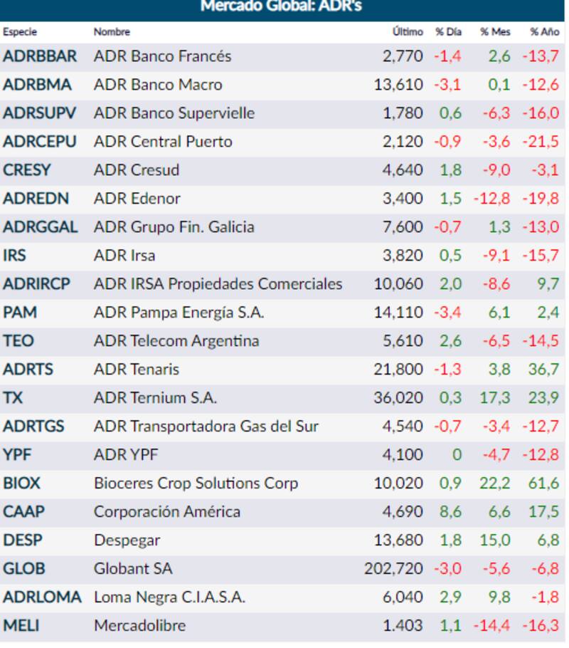 Entre los ADR el comportamiento estuvo más repartido, con tantas velas verdes como rojas. La principal alza la arrojó Corporación América (+8,6%) y la principal caída la tuvo Banco Macro (-3,1 por ciento).