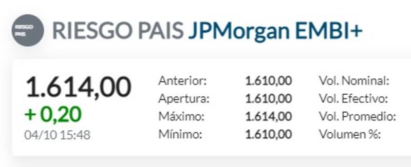 En línea con esta debilidad de los bonos en dólares, el riesgo país argentino se mantiene por encima de los 1600 puntos. El índice que mide JP Morgan escala este lunes 4 unidades hasta los 1614 unidades, y se aleja todavía más de la zona de 1450 puntos que alcanzó el lunes posterior a las elecciones PASO.