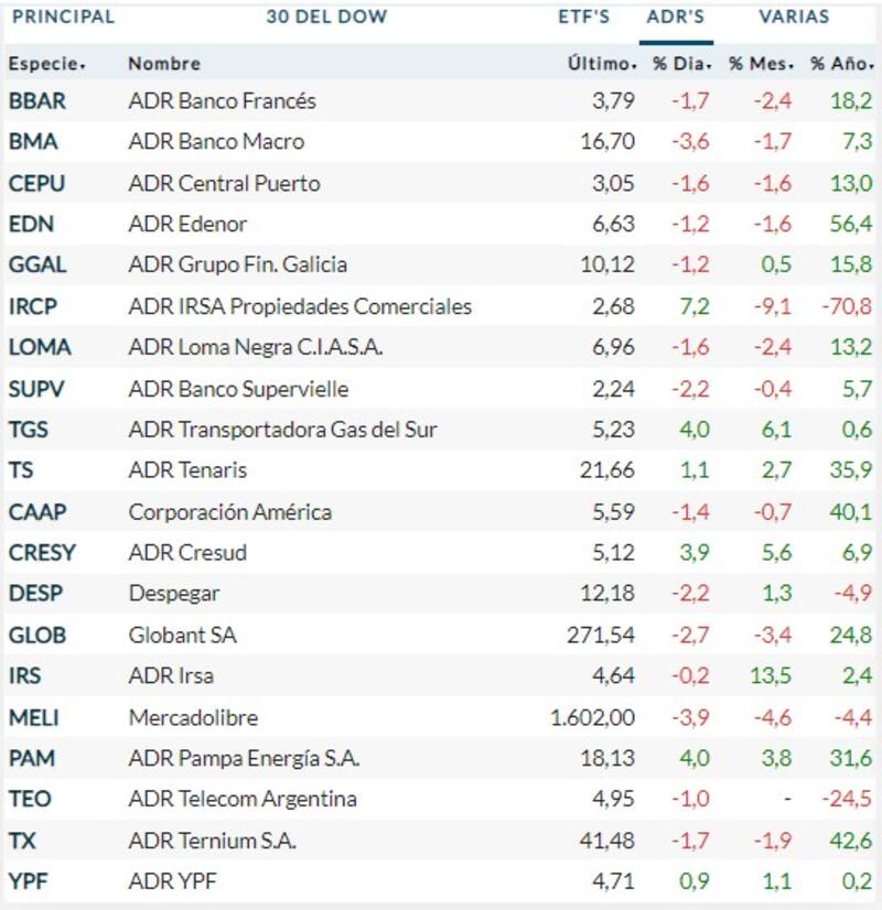 La mayoría de las acciones argentinas pierde terreno en Nueva York y en la plaza bursátil local. MercadoLibre y el Banco Macro lideraban las caídas entre las acciones argentinas que cotizan en Wall Street, mientras que IRSA Propiedades Comerciales rebota 7,2% tras haberse hundido 10,8% el viernes. Fue luego de que se conociera que la compañía será absorbida por IRSA, de modo de que ambas compañías funcionen bajo una única estructura.