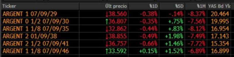 En línea con este escenario de mayor debilidad externa, los bonos soberanos en dólares emitidos bajo ley extranjera caen entre 0,4% y 1% a lo largo de casi toda la curva.