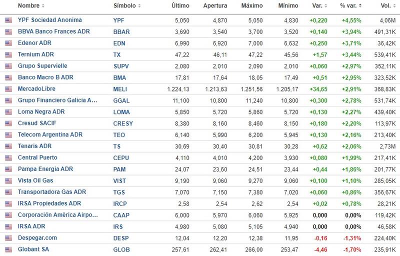 En cambio, la mayoría de las acciones argentinas cerraron en verde en Wall Street, en línea con los índices externos de referencia. Las subas fueron lideradas por YPF (4,5%) y BBVA (3,9%), y las únicas bajas se dieron en el sector tecnológico, con Globant (-1,7%) y Despegar (-1,3%). En tanto, el Merval subió 1,6 por ciento.