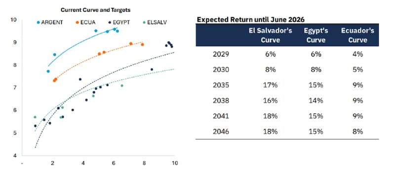A modo de referencia, desde Adcap Grupo Financiero consideran que en el caso en el que los bonos converjan hacia la curva de El Salvador, los bonos podrían subir entre 6% y 18%, con mayor potencial en el tramo medio y largo.