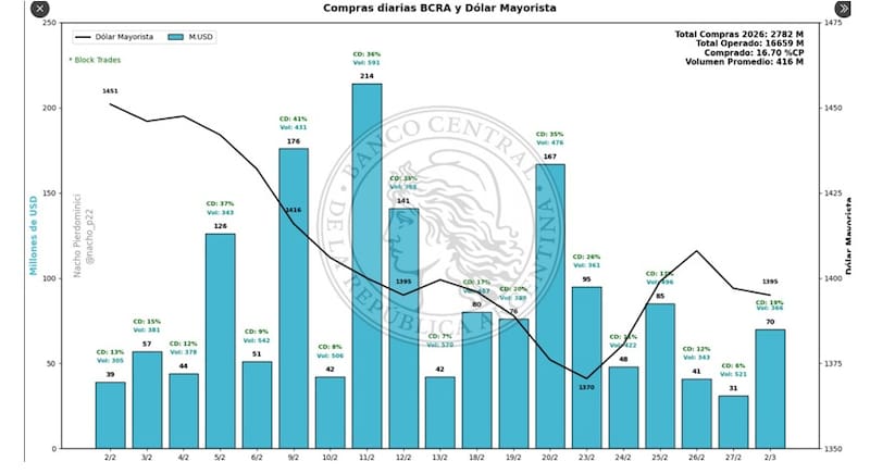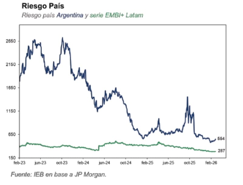 “El Central encadenó más de 38 ruedas consecutivas con saldo comprador, acumulando más de u$s 2682 millones en lo que va del año, de los cuales más de u$s 1524 millones corresponden a febrero. Pese a ello, el Riesgo País no solo no comprimió, sino que escaló desde la zona de 500 puntos de fines de enero hasta la zona de 545 puntos, en un contexto internacional desafiante”, detalló